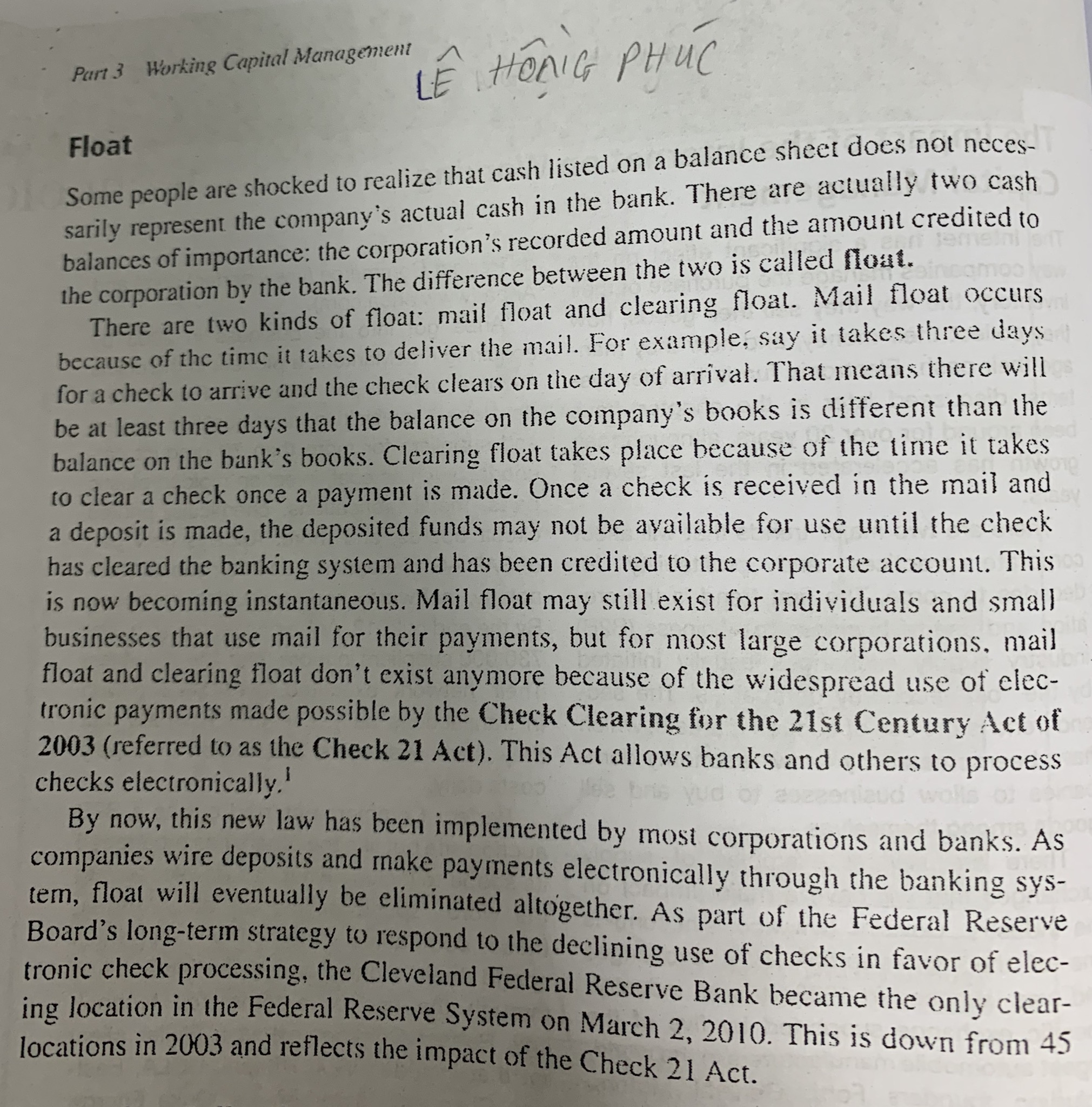 Float, Cash Flow ForecastsFloat(dang chuyen): Float is the difference between the corporation's recorded amount and the amount credited to the corporation by the bank. Float Aiailable balance Ledger halance (book balance) Tien dag chuyên =ton quỹ TK NH-Ton quỹ ke toán Checks written by a firm disbursement float generate Checks received by the firm create collection float Cash Flow Forecasts Cash flow fore casts show the expected receipts and payments during a forecast period and are a vital management control tool, especially during times of recession A simple pro-forma is given below: Sales volume Revenue Costs One-off mdses Typical format (the following slide) | |